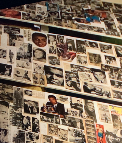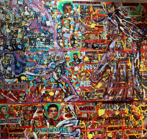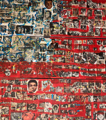 Artist also a collector of vintage images and posters from his teenage years in the 80s. He collected boxing imgaes from vinatge magazine for many years. That was his childhood gateway to western society in a war torn island, was influenced as a child soldier where he managed to aviod to persue a life without violence to support and influence his extended family where nobody had university education due to the poverty and civil war in Sri Lanka [british ceylon] .Sporting star was his escape and muhamed Ali will inspire to do sports as took up athletics and cricket in th1970s to keep him away from civil war. So he wanted to do work for the greatest sportsman ever.. He procured three 6 foot 72 inch ply wood . Three of them and start collaging, after pasting white newspaper on the wood then i started to mix the images of his long carrer. Then he wanted a american flag as star and stripes as a backdrop.The black sportsman of America was the great godly motivation to the whiole world through hard work and dedication in the 70s when telvison ariived to our streets shops. That will change our lives with movies.